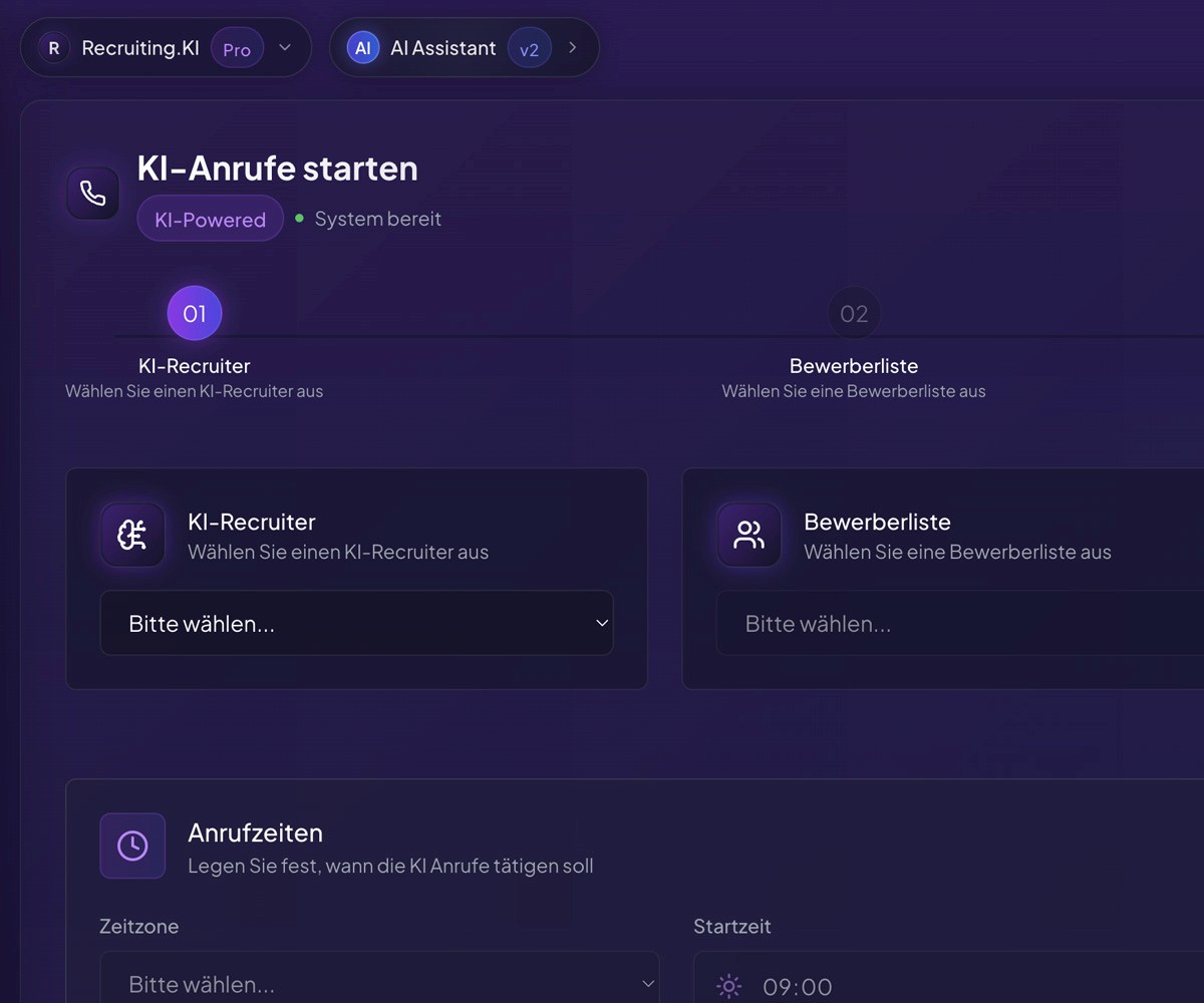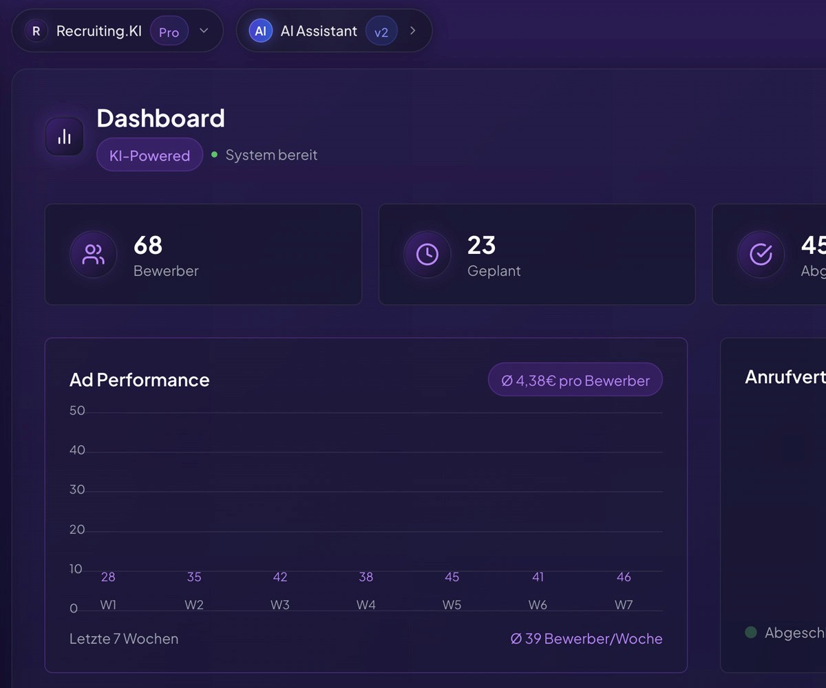 Mit Recruiting.ki stellst du interne AI Agenten ein, die auf Knopfdruck zielgerichtet Bewerber generieren, Bewerbungsgespräche führen und alles abdecken, was eine gute Recruiting-Abteilung ausmacht.